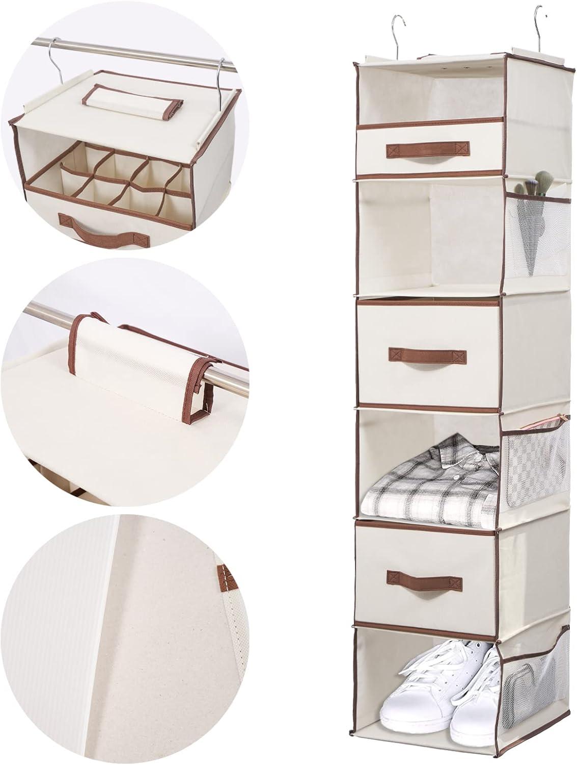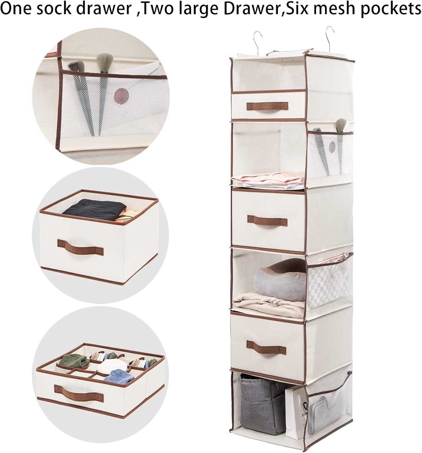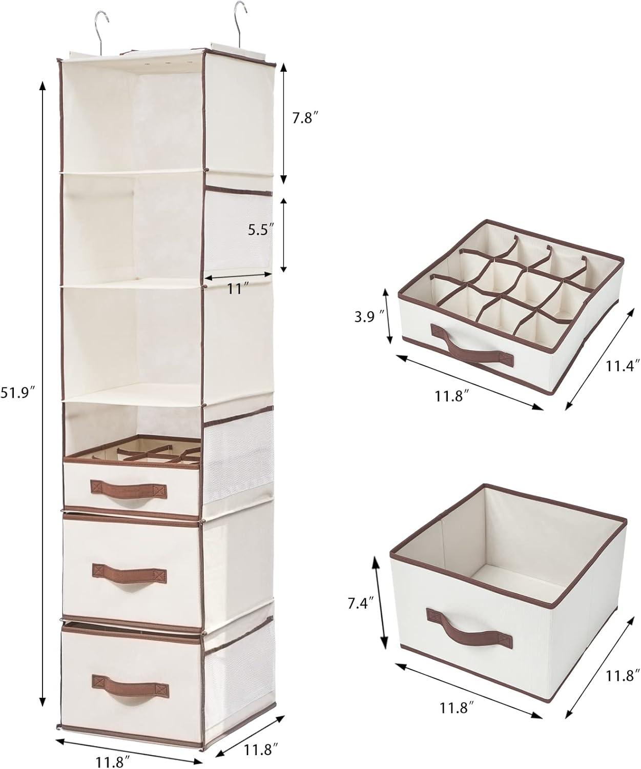Large Capacity:6 shelf(1 shelf size is L11.8*H7.8*W11.8in),2 Large Drawer(1 drawer size is L11.8*H7.4*W11.4in),1 Sock Drawer(size is L11.8*H3.9*W11.4in),6 mesh side pocket(size is L11*W5.5in).