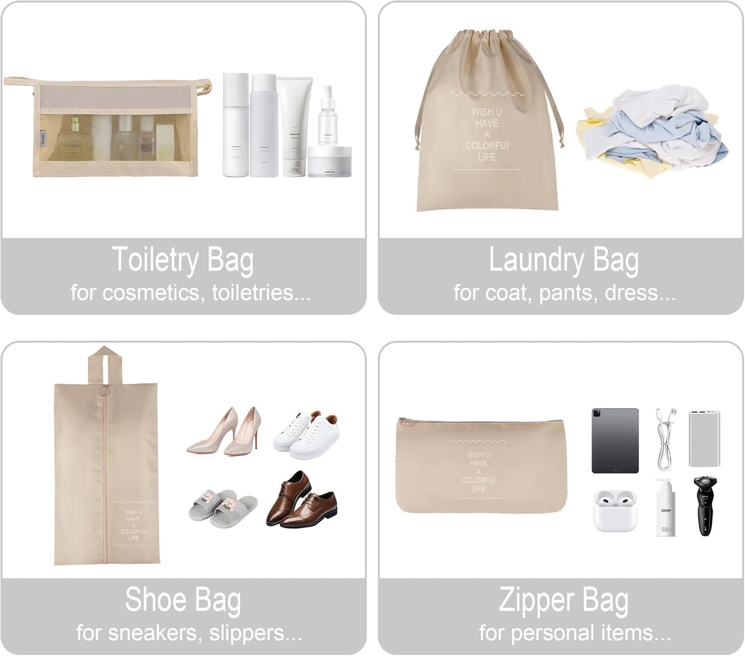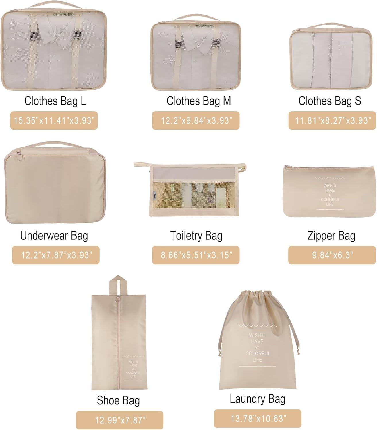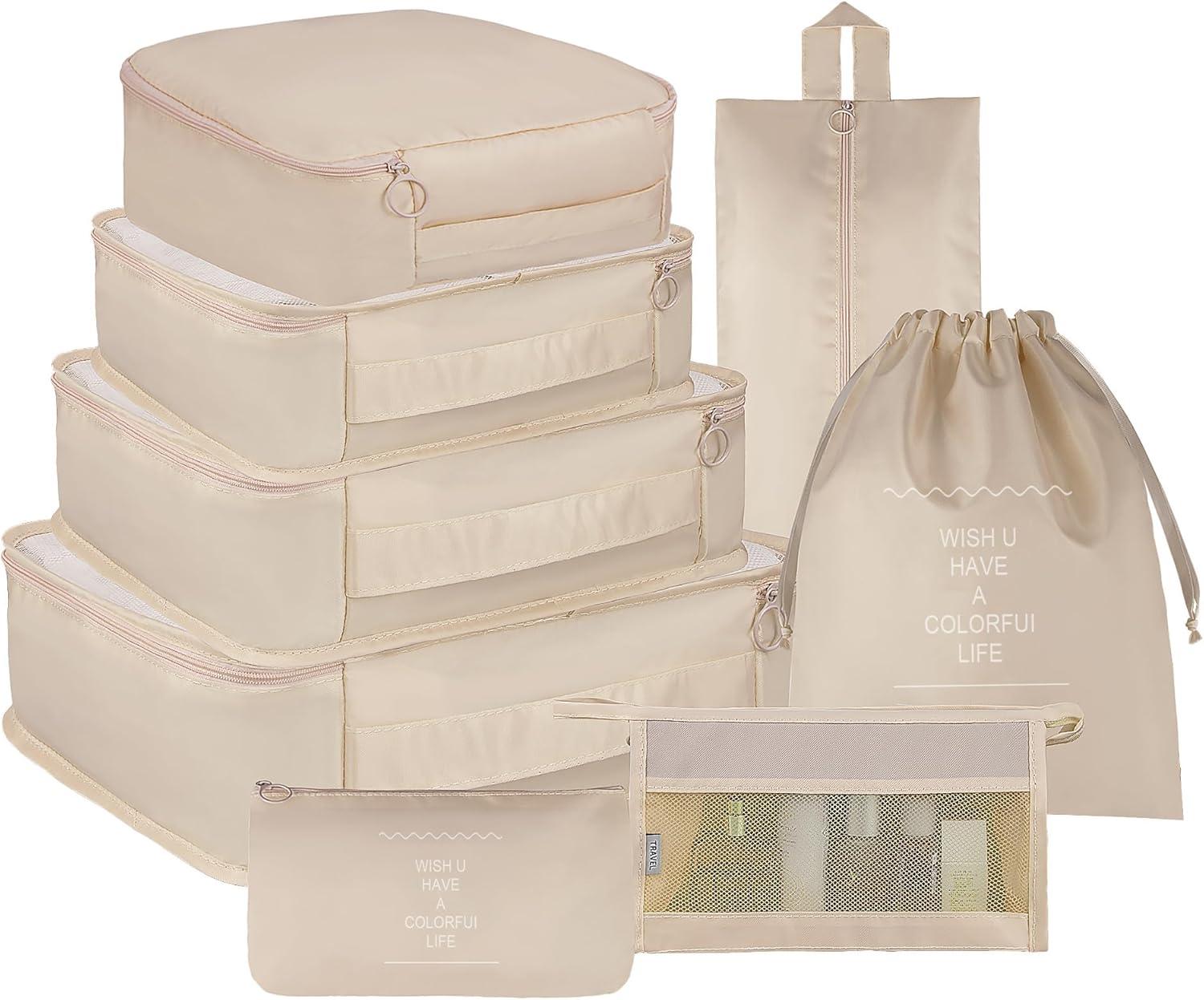 Vercord 8 Set Travel Packing Pods Luggage Organizers Cubes with Laundry Bags Accessories(Beige-8set)