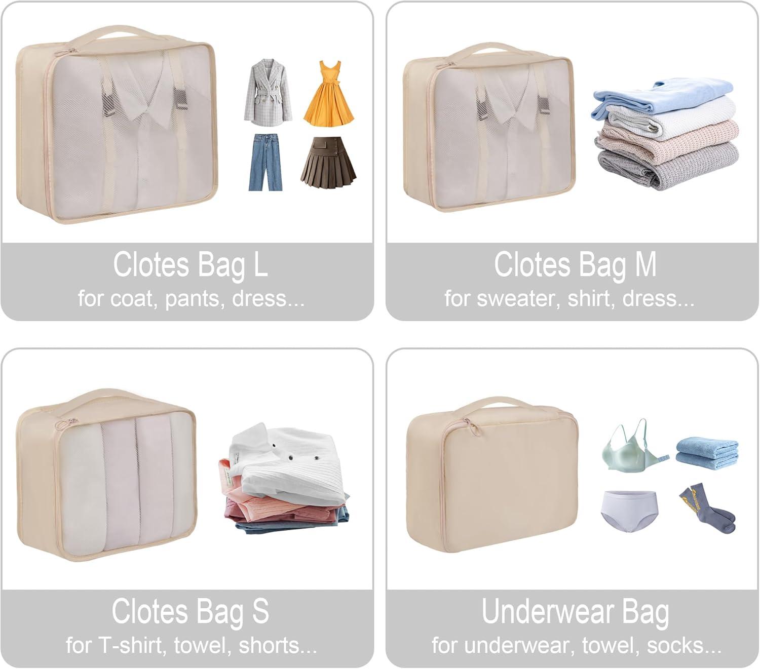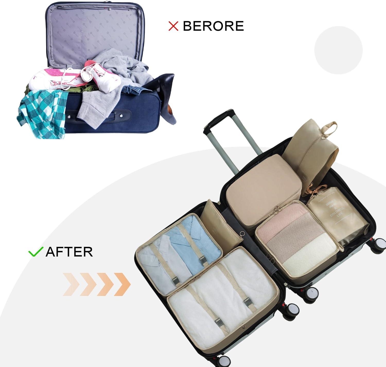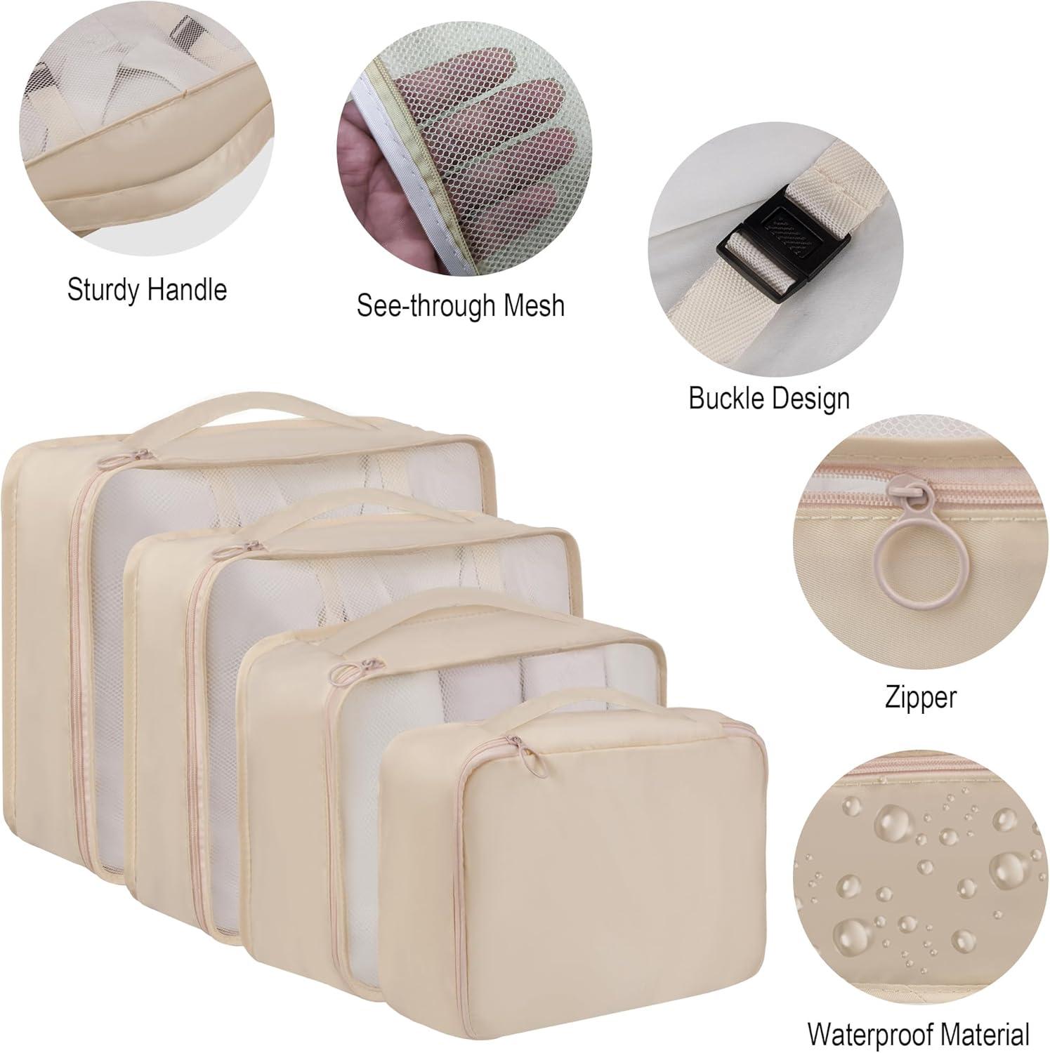 Vercord 8 Set Travel Packing Pods Luggage Organizers Cubes with Laundry Bags Accessories(Beige-8set)