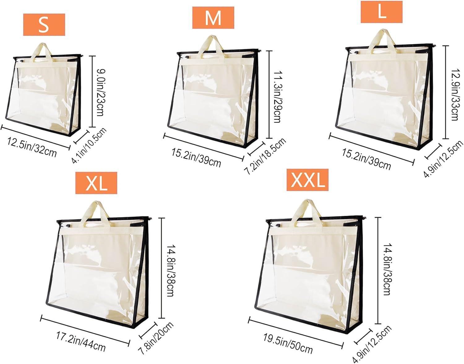 Structure: These purse organizer holder is sort of wedge-shape, so check the size carefully and make sure your purse could fit in well. Transparent design help you get the one specific bag quickly. A PP-Board at the bottom to help stabilise the structure and keep the bag inside steady when hang up to store. Zipper closure and a handle also help to use.