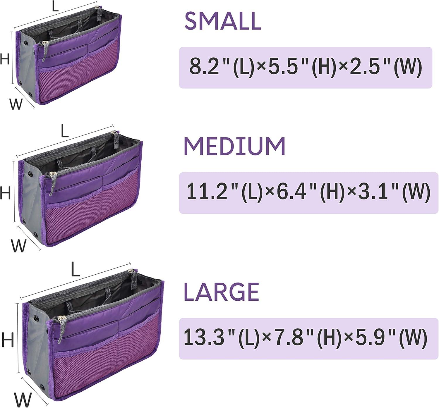 Dimension (Length*Width*Height), Small: 8.2″*2.5″*5.5″; Medium: 11.2″*3.1″*6.4″; Large: 13.3″*5.9″*7.8″. Measure your handbags' interior first to make sure you get the fit one.