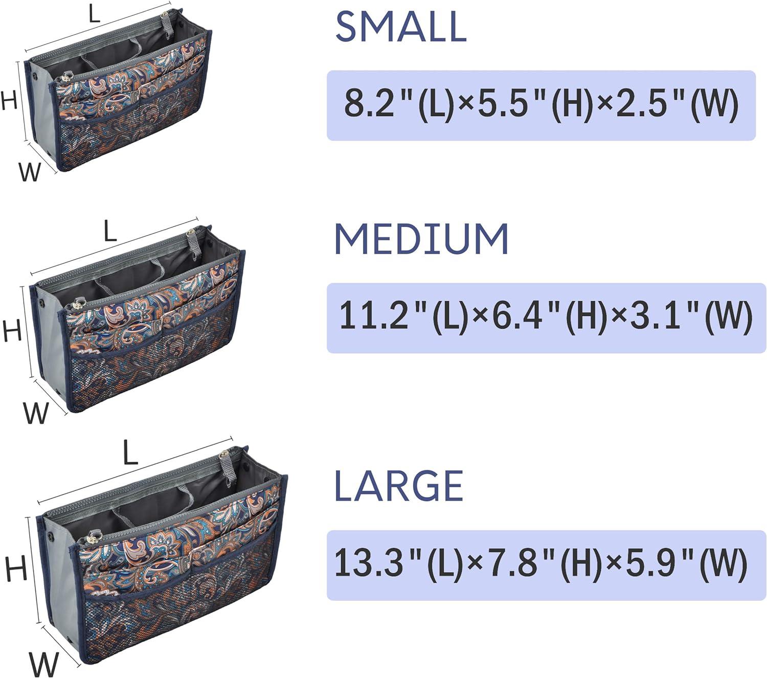Dimension (Length*Width*Height), Small: 8.2″*2.5″*5.5″; Medium: 11.2″*3.1″*6.4″; Large: 13.3″*5.9″*7.8″. Measure your handbags' interior first to make sure you get the fit one.